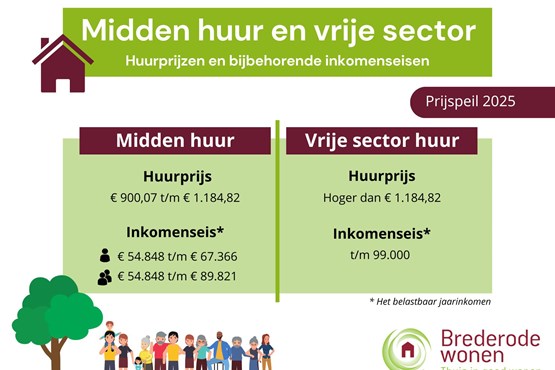 Voor een woning in de midden huur moet het belastbaar jaarinkomen tussen de € 54.848 en € 89.821 liggen. Voor een woning in de vrije sector moet het belastbaar jaarinkomen boven de € 689.821 liggen (prijspeil 2025).